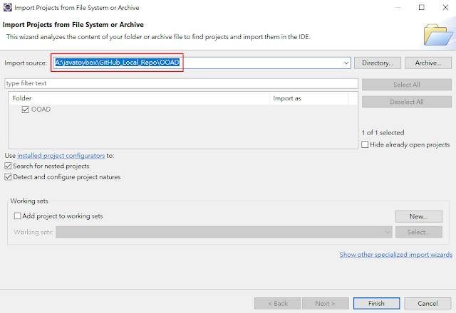 Import source 就是現在 Local Git Repo 裡的 Working Tree,按【Finish】。